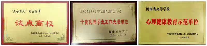 2019年6月,该校被河南省委高校工委、河南省教育厅确定为 “三全育人”综合改革试点高校和河南省普通高等学校心理健康教育示范单位。2019年12月,学校被省委高校工委、省教育厅授予第三届“大美学工”十佳优秀学生工作先进单位。