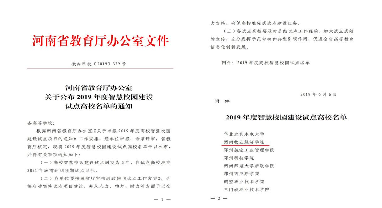 2019年6月,河南省教育厅下发了《关于公布2019年度智慧校园建设试点高校名单的通知》(教办科技〔2019〕329号),河南牧业经济学院获批2019年度高校智慧校园建设试点高校。10月29日,以省直文明办主任王勇生为组长的省级文明校园考评组莅临该校,对河南牧业经济学院创建省级文明校园工作进行考评,该校顺利通过了考评。河南牧业经济学院已连续两届保持了省级精神文明单位荣誉称号,顺利通过了省级文明校园考评成为该校精神文明建设的新标识。