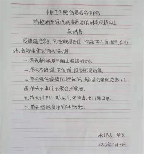 在学校号召下,信商学子积极响应,像代书豪、吴倩玲这样,在疫情防控中参与到当地防控工作,始终坚守一线、主动冲锋在前的学生党员、积极分子还有很多。广大学生还自发手写了学生承诺书,表示要在疫情防控中展现信商学子的担当与行动。