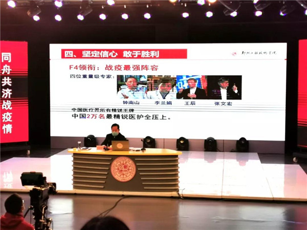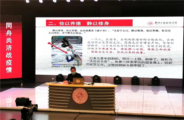 郑州工程技术学院党委书记周春辉在课堂上以《同舟共济战疫情,众志成城卫家国》为题,分4个篇章向师生宣讲了当前全国疫情情况、国家措施、党中央关怀、各地贯彻落实举措等并结合学校实际,介绍了学校贯彻落实疫情防控工作的具体做法,表达了学校党委在疫情特殊时期对师生提出的希望和要求。