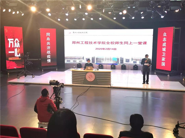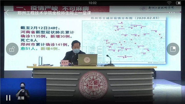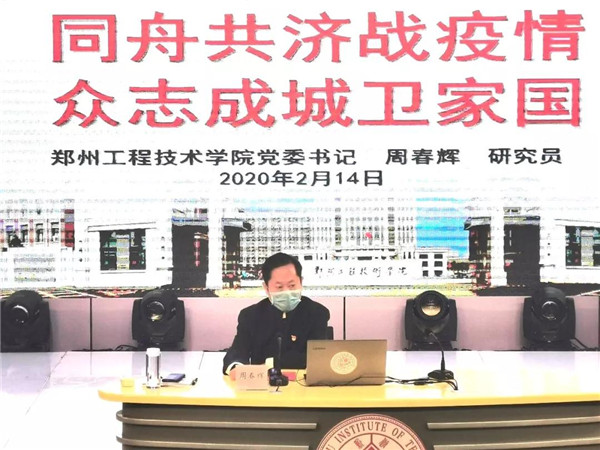 2月14日,郑州工程技术学院党委书记周春辉在映象网教育频道,以直播方式为全校师生上课,传达党的各项方针政策,回应全校师生对疫情的关切,勉励全校师生同舟共济共抗疫情,众志成城卫家园。
