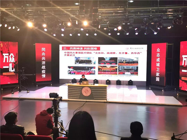 周春辉在课堂上以《同舟共济战疫情,众志成城卫家国》为题,从武汉告急、全国震动,闻警而动、全校皆兵,疫情汹汹、科学应战,艰难困苦、玉汝于成,分4个篇章向师生宣讲了当前全国疫情情况、国家措施、党中央关怀、各地贯彻落实举措等并结合学校实际,介绍了学校贯彻落实疫情防控工作的具体做法,表达了学校党委在疫情特殊时期对师生提出的希望和要求。