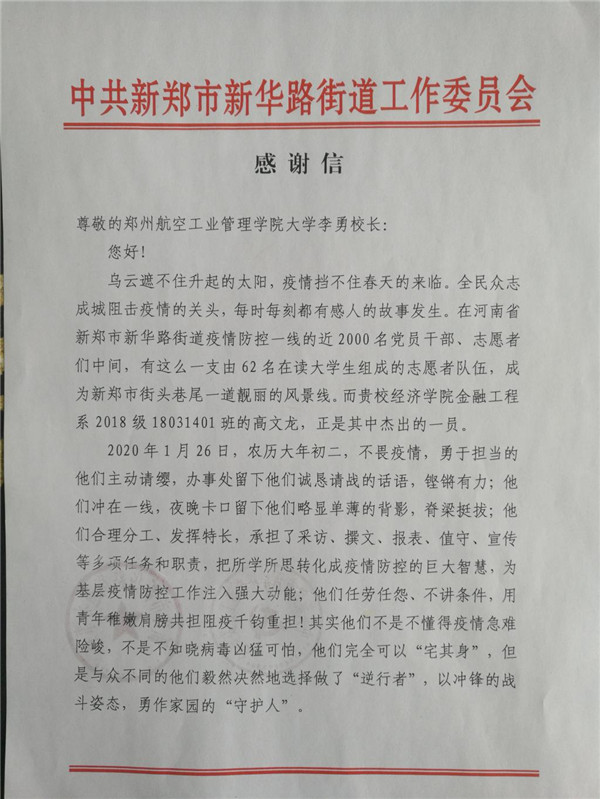 2月19日,郑州航空工业管理学院收到一份邮政快递,是由新郑市新华路街道工作委员会和新华路街道办事处专门邮寄的感谢信: