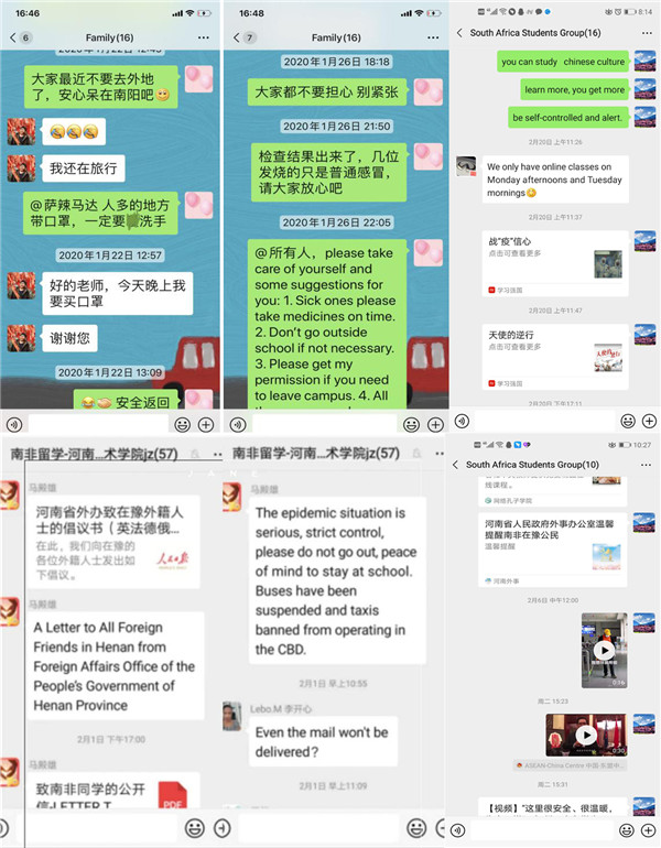 这场突如其来的疫情,让该校很多留学生都感到有些“不知所措”,每个人都是第一次经历这样的情况,身在异乡,大家心中难免也有些许的慌张与恐惧,针对这一情况,班主任老师及时在留学生群中发布疫情防范的相关知识,全力抗击新冠病毒的每日实况等。对于外媒一些不切实际的疫情报道,班主任老师对留学生加强疫情形势、预防知识、抗疫措施的正面宣传,同时为了提高留学生的战“疫”信心,班主任老师们分享很多其他高校留学生疫情防控相关事迹,鼓励他们积极传播正能量。许多留学生都深刻感受到在面对灾难时中国人民众志成城团结一致,感受在抗击疫情时中国人民的守望相助无私奉献,大家在接受心灵洗礼的同时,也进一步坚定了战“疫”必胜的信念。班主任老师的细微关怀和宣传引导逐渐消除了留学生的恐慌情绪和回国意愿,大家纷纷积极配合学校的防疫措施,很多同学还自觉参加录制抗疫加油视频,送上真挚的祝福。