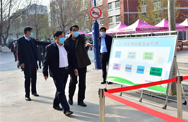 王登喜一行实地察看了该校大门体温监测卡点、校医院、学生宿舍、餐厅等重点区域,听取赵学通、陈丙义关于学校疫情防控工作及开学准备情况汇报。王登喜充分肯定了该校疫情防控工作取得的显著成效,并向坚守在防控一线的教职员工表示亲切慰问。王登喜强调,高校办学规模大、学生来源广,是疫情防控的特殊场所,学校要做好组织准备,充分发挥各级党组织的战斗堡垒作用,建立严密的疫情防控组织;要做好技术准备,学校要加强与市卫建部门和疾控中心的联系沟通;要做好物资准备,学校要备足防控疫情所需口罩、体温枪、消毒液等物资;要及时做好心理疏导,确保学校疫情防控工作万无一失。