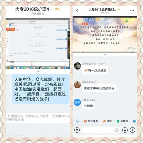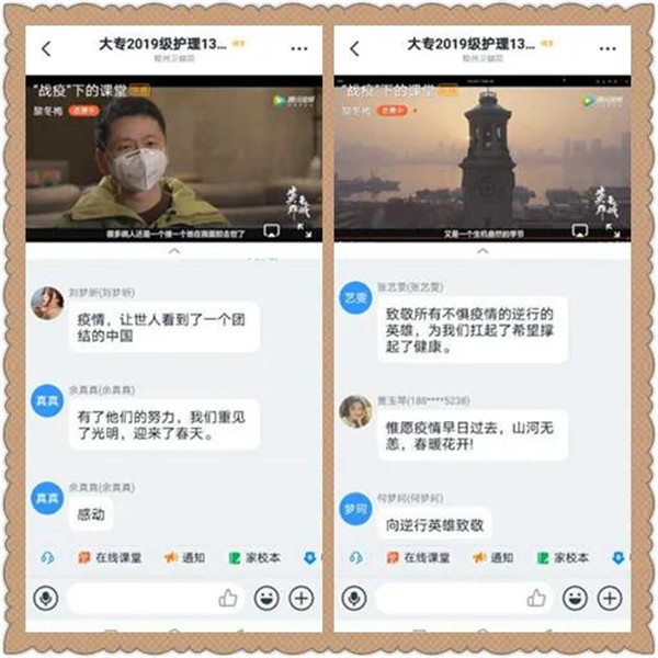 2019级护理2班刘倩同学在课堂互动时真情流露说道:“抗疫胜利看到曙光,特别渴望早日回到校园,但我们还需要再坚持一下。在这个漫长的假期里,自己思考了很多,梦想再也不虚无缥缈了,作为一名护理专业的学生,应该更加努力,让祖国见证自己的成长,让自己的成长助力伟大祖国!”