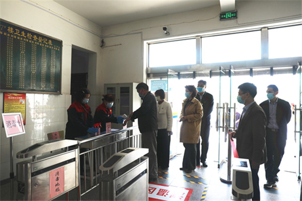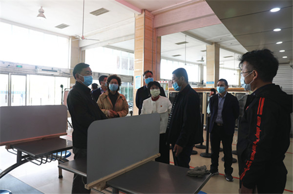 丁建志一行实地查看了师生入校测温区、学生宿舍、留观室、医务所、学生餐厅、教学区等场所,实地演练师生进入各场所路线及体温测量、分隔排队、就餐、上课等流程,详细了解校园封闭管理、消杀工作安排、学生返校组织、复课后学习及生活安排、突发情况应急处置预案、学校防疫物资储备等情况。丁建志对学校复学各项准备工作给予充分肯定,他表示,学校认真贯彻中央、省委和省教育厅及开封市相关工作要求,各项工作严谨细致、责任明确、流程规范、措施到位、网格划分科学合理。他强调,复学前后防疫工作要一级压一级,层层抓落实,责任到岗到人;要高度重视食品质量卫生、学生心理疏导、生活卫生习惯养成等工作,防范聚集性活动,做好各类人员排查,为学生返校安全保驾护航。他对学校下一步工作提出了明确要求:一要提高站位,切实把师生生命安全和身体健康放在首位。二要按复学时间倒排防疫工作工期,进一步细化各项工作流程,做好各环节工作及衔接演练。三要注意“线上”“线下”教学衔接,继续做好未返校学生的线上教学工作。
