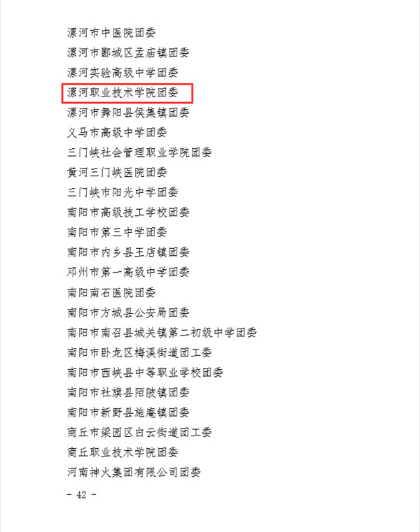 在漯河市“两红两优”评选中,漯河职业技术学院双汇学院团总支、许慎文化学院团总支荣获2019年度“漯河市五四红旗团支部”,电气电子工程系团总支书记杨洋老师、双汇学院团总支书记刘智老师荣获2019年度“漯河市优秀共青团干部”,机电工程系18级机电一体化二班张鹏同学、双汇学院18级市场营销一班高中耀同学荣获2019年度“漯河市优秀共青团员”称号。