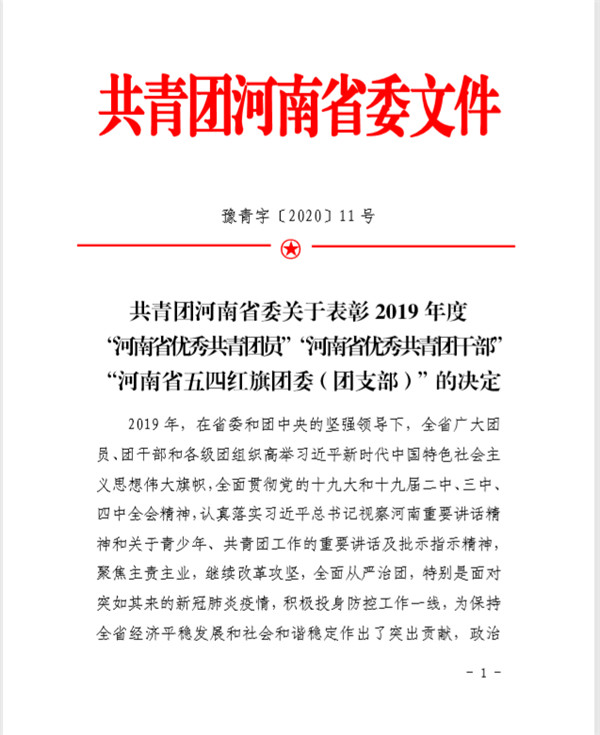 近日,从共青团河南省委和共青团漯河市委传来喜讯,漯河职业技术学院团委在2019年度共青团工作中荣获多项省市级荣誉。校团委被评为2019年度“河南省五四红旗团委”、2019年度漯河市“共青团工作先进集体”。“河南省五四红旗团委”是团省委授予河南共青团基层组织的最高荣誉,每五年为一个创建周期,此次获评“河南省五四红旗团委”,是漯河职业技术学院继荣获2015年度“河南省五四红旗团委”荣誉称号之后再获表彰。这既是对漯河职业技术学院共青团工作的肯定,也是对全校各级团组织和广大团员青年的鼓励。
