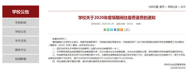 5月28日,河南省教育厅、河南省发展改革委、河南省财政厅三部门在河南省教育厅网站发布《关于做好疫情防控期间学校收费管理工作的通知》,对全省各级各类学校和幼儿园疫情防控期间收费管理工作进行了安排部署。遵照王淑芳董事长指示,该校迅速响应上级要求,于5月29日在学校官网首页和官方微信公众号发布《学校关于2020年疫情期间住宿费退费的通知》,退还全校学生本学期所交住宿费用,金额为全年住宿费用的一半,共计2000余万元。2020届毕业生住宿费已于2020年6月4日 13 点40分发放至每一位毕业生的银行卡中;非毕业年级所退住宿费用正在整理,将于近期完成退费手续。在退还全体学生本学期住宿费用的同时,学校董事会积极响应国务院提出的“六保”“六稳”工作任务要求,在疫情期间对校内所有商户减免三个月租金,以减轻商户的经济压力,为广大商户纾困。疫情期间,该校坚持做好疫情防控工作,坚持做好本职工作,严格落实上级要求,不给政府添麻烦,彰显了该校一贯坚持的“取之于学生,用之于学校,回馈于社会”的办学理念。