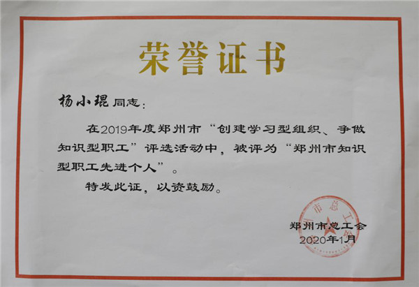 近日,郑州市总工会下发《关于表彰2019年度郑州市职业道德建设十佳单位、十佳个人的决定》(郑工文【2020】4号)和《关于表彰2019年度郑州市“创建学习型组织、争做知识型职工”活动先进单位和先进个人的决定》(郑工文【2020】5号)对郑州电力高专进行表彰。郑州电力高专被授予“2019年度郑州市职业道德建设十佳单位”荣誉称号,郑州电力高专能源与动力工程学院杨小琨被授予“2019年度郑州市知识型职工先进个人”荣誉称号。