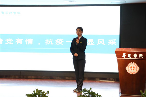 2020级会计学院荆雅洁同学微课的题目是《疫情无情党有情 抗疫一线显风采》,从“抗疫行动,尽显党的核心作用、党的模范作用及我们青年学生要向共产党员看齐”三个方面讲起,一个个生动鲜活的事例显示出中国共产党的集中领导是我们取得抗疫斗争胜利的根本保证,强大的国家是我们最大的依靠。希望同学们在灾难面前都做到风雨同舟,携手共进,把疫情灾难当教材。并且在抗击疫情的战争中,培养自身坚韧不拔、从容不迫的奋斗精神和赤诚仁爱的胸怀天下的家国情怀,真正与祖国共同成长,让不幸见证我们成长的足迹。