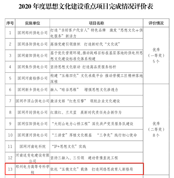 近日,中共国网河南省电力公司委员会办公室下发《关于2020年度思想文化建设重点项目完成情况的通报》,学校思想文化建设成果《依托“五微文化”载体 打造网络思政育人新格局》通过省公司验收评估、现场发布、专家评审及单位互评等环节,最终获评国网河南省电力公司2020年度思想文化重点项目优秀成果二等奖。
