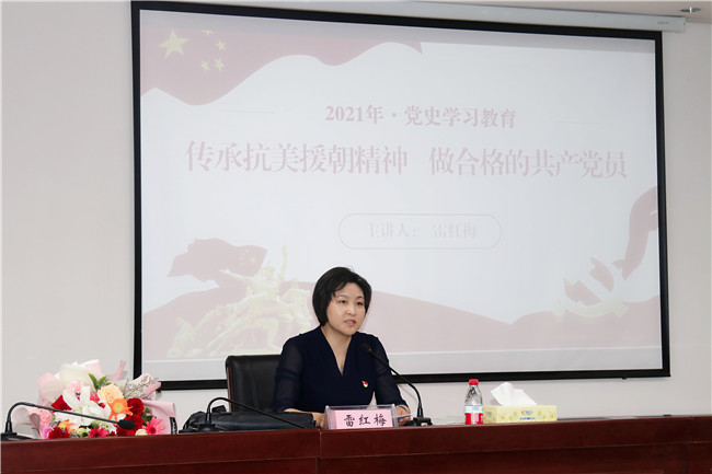 雷红梅以“传承抗美援朝精神 做合格的共产党员”为题,通过对抗美援朝特等功臣、国家一级战斗英雄父亲雷保森老英雄个人成长、革命生涯的回顾,生动感人的讲述着父亲雷保森不屈不挠的革命精神和淡泊名利的公仆本色,通过专题党课教育,让每名党员同志知责于心、担责于身。她表示,父亲雷保森一生忠于党、忠于人民,他的一生是革命的一生,战斗的一生,艰苦奋斗的一生,是为党和人民无私奉献的一生。父亲的精神无形中深深的影响着我们,我们在各自的岗位上勤勤恳恳、兢兢业业。从不以英雄的后人自居,同时也教育下一代不要辜负英雄后人这个比金子还贵的荣誉,不能给英雄抹黑。