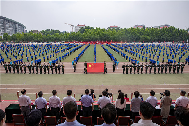 在激昂的音乐声中,参加展演的3800名同学跑步入场,用青春灿烂的笑容和热情洋溢的身姿拉开了开幕式的帷幕。英姿飒爽的校仪仗队,迈着铿锵有力的步伐,护送国旗入场,现场师生向国旗行注目礼。随着音乐响起,全场师生齐唱国歌,庄严雄壮、气氛热烈。