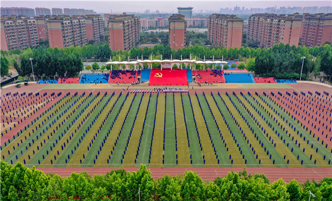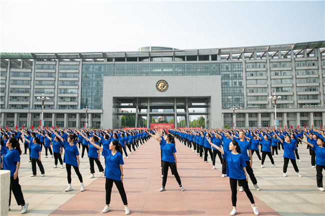 “庆祝中国共产党成立100周年——百城联动/百首原创/百万同跳”大型排舞展演活动现场,伴随着响彻校园的音乐声,3800余名大学生表演者整齐分布在学校东田径场和五星广场,共同表演了《没有共产党就没有新中国》大型排舞节目。经过数月的辛苦准备与精心排练,同学们动作优美,整齐划一,表演激越昂扬,极为壮观,充分展示了河南中医药大学学子的健美身姿和奋发有为、向上向善的精神风貌。