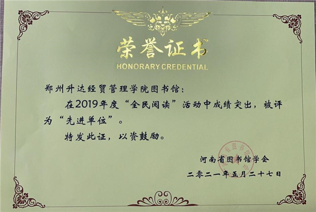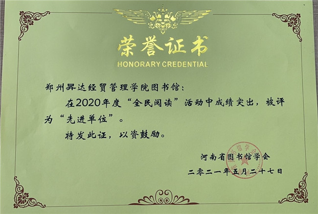 受疫情影响,2020年河南省图书馆学会年会暂缓召开,此次大会对两年来全民阅读活动进行了总结和表彰。该校图书馆发挥“全民阅读示范基地”的引领示范效应,坚持创新开展“全民阅读”系列活动,尤其在疫情防控期间敏捷反应,整合馆藏资源和社会资源开展线上服务,为保障师生学习科研提供文献资源保障,围绕“停课不停教”配合教务处开展网上教学所需的电子教参和电子图书保障工作。同时,积极开展“以‘读’攻毒——阅读战‘疫’”等阅读推广活动。在河南省高校“悦读 新知 致敬”主题朗读比赛中,该校共有2600余名师生参赛,获得特等奖1名,一等奖2名,二等奖2名,三等奖3名,优秀奖17名,成为全省获得奖项比例最高、获奖人数最多的高校。为使资源有效利用,校图书馆针对师生开展了一系列专题培训活动,大力宣传馆藏数字资源,培训数据库使用技巧,推广使用经验。这些做法在学校师生和全省高校中都引起了强烈反响,也吸引《大河报》记者和媒体关注并报道。此次大会授予该校2019年度“全民阅读先进单位”和2020年度“全民阅读先进单位”称号;图书馆胡芳同仁获得2019年度“全民阅读先进个人”、张鹏同仁获得2020年度“全民阅读先进个人”称号。
