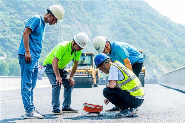 施工现场,河南交通职业技术学院工程技术集团有限公司派专人负责本次智能施工质量检测,按照预前同项目业主单位、中心试验室、施工单位、监理单位联合制定的智能施工检测方案,对智能施工现场的摊铺、碾压质量进行试验数据采集,施工完成后对沥青路面的渗水、平整度、摩擦系数、厚度、压实度进行检测,检测结果均符合规范要求。检测数据充分验证了智能摊铺碾压施工技术完全可以在高等级公路路面施工推广应用。