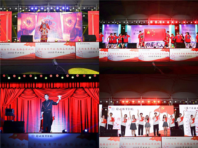 晚会共分为初心永驻、风华正茂、继往开来、前程锦绣四个篇章,节目形式多样,精彩纷呈。在斗志昂扬的军体拳表演《喜迎百年华诞,共筑青春梦想》和红色歌曲《实事求是》中,演出拉开帷幕。民族舞《白马》展现了蒙古族的热情奔放与豁达豪迈;经典豫剧《穆桂英挂帅》唱出了传统戏曲艺术的魅力和该校学子的高水准才艺;情景剧《青春的年华》回忆了大学四年的青春岁月,畅想了对未来的美好憧憬;街舞《一条大河》用现代舞蹈演绎了红色经典和抗疫精神;歌曲串烧和器乐表演展示了青春活力和器乐文化;魔术《红白幻象》用高超的表演技艺让观众亲眼见证了魔术的奇幻与美妙;朗诵《以青春之名 贺百岁华诞》深刻的思想和真挚的情感抒发了青年学生歌颂青春、追寻梦想、坚持奋斗的赤子情怀,表达了对党和祖国的无限热爱和诚挚祝福;小合唱《再一次出发》唱出了奋进新征程的豪迈;T台秀《天使之路》用优雅身姿、优美的步伐搭配靓丽的服饰走出了经贸学子的自信之美和艺术之美;歌伴舞《幸福万年长》用专业的演唱、柔美的舞蹈表达了对党和祖国、对郑州经贸人的美好祝愿;舞蹈《未来式》用青春的激情和活力将晚会再一次推向高潮;演出在大合唱《党啊,亲爱的母亲》和《毕业歌》中圆满落下帷幕。
