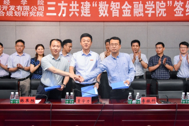 党委副书记董学力、同花顺集团运营总监兼高校事业部总监李振科、河南省产教融合规划研究院副院长韩尊胜分别代表各方签订了数智金融学院战略合作框架协议。