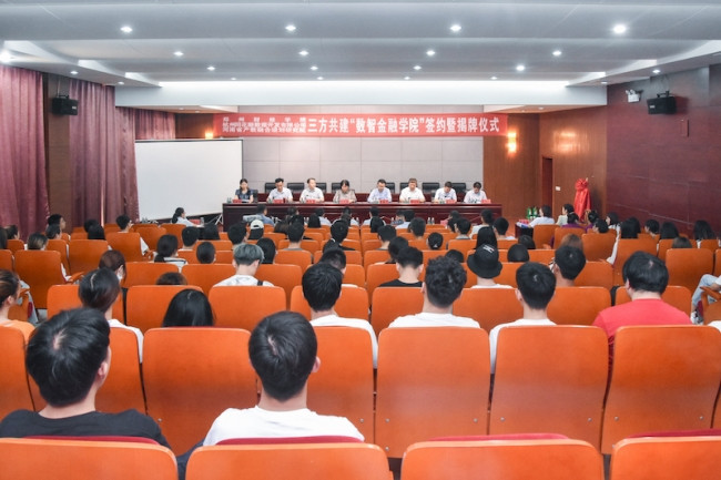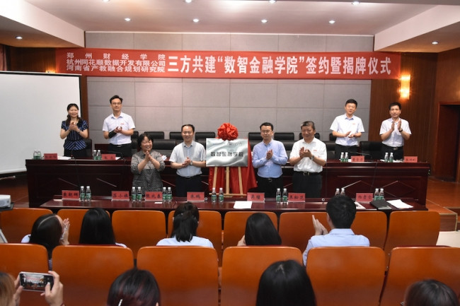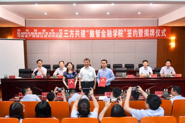 6月11日上午,郑州财经学院与杭州同花顺数据开发有限公司、河南省产教融合规划研究院三方共建“数智金融学院”签约暨揭牌仪式顺利举行。校长于向英、常务副校长李庆阳、党委副书记董学力、校工会主席张彪,教务处处长张顺利以及金融学院师生代表参加了签约仪式。签约仪式由金融学院院长张效梅主持。