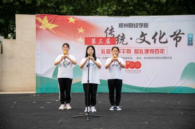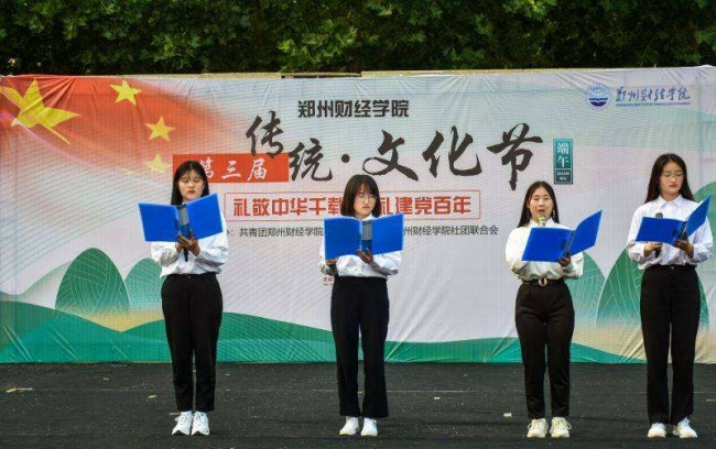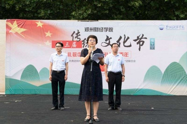 为引领学校青年团员弘扬中华民族优秀传统文化,坚定文化自信,增强传承传统文化的责任感和使命感,6月10日下午,郑州财经学院在文化广场举行第三届“礼敬中华千载,献礼建党百年”传统文化节启动仪式。副校长陈静、学生处处长陈志强、校团委书记周二涛出席活动,1000余名学生参加本次活动。启动仪式由校团委陈诗轩老师主持。