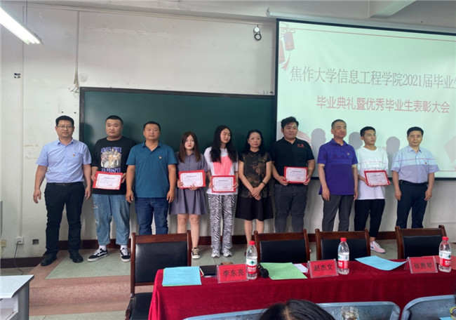 6月10日上午,信息工程学院2021届毕业生毕业典礼暨优秀毕业生表彰大会在一教隆重举行。院领导、全体辅导员老师及毕业生代表等参加本次活动。毕业典礼在雄壮的国歌声中拉开帷幕。满载着丰收的喜悦,院领导为2021届优秀毕业生颁发荣誉证书并合影留念。(魏豪)