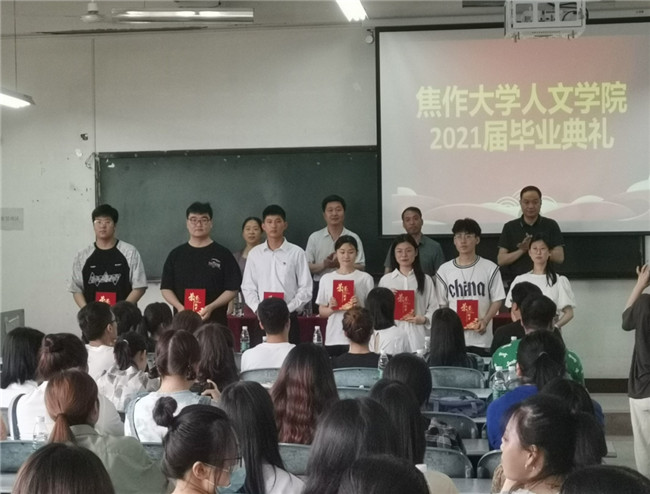 6月6日上午,在崇学楼409教室里,人文学院2021届毕业生毕业典礼暨优秀毕业生表彰大会在雄壮的国歌声中拉开帷幕。校党委委员、副校长吴玉伦参加了本次活动。院长徐曼、教师代表扈晓婕以及在校生代表分别为毕业生送上了美好的祝福。与会领导为2021届优秀毕业生颁发荣誉证书并合影留念。 吴玉伦代表学校向全体2021届毕业生致以诚挚的祝贺和美好的祝愿!向所有默默奉献的老师们、亲友们,致以崇高的敬意和衷心的感谢!感谢同学们用智慧、真诚和汗水,通过不懈的努力,为学校的史册增添了新的光彩。希望同学们不断学习、思考、历练、完善自我,在属于自己的新天地中成就自己的梦想!