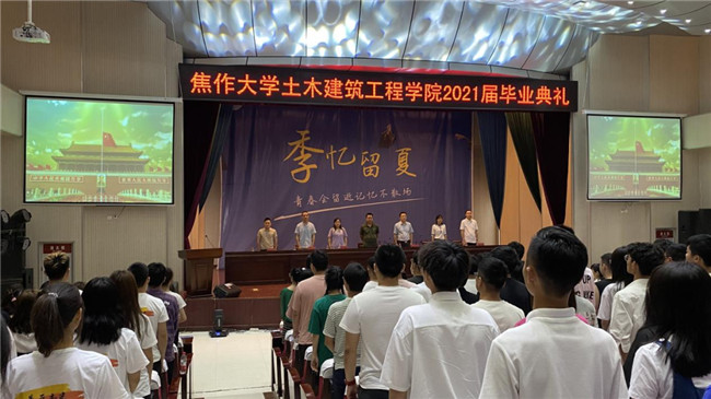 6月10日上午,土木建筑工程学院2021届毕业典礼在学术报告厅隆重举行。本次典礼全程直播,线下线上见证了2021届毕业生顺利完成学业,共享开启新征程的喜悦。 毕业典礼在鲜红的五星红旗和雄壮激昂的国歌中拉开帷幕。学院院长李整建为毕业生致辞。他希望大家出走半生,归来仍是少年。学院副书记王军为毕业生做毕业寄语,希望大家坚定信仰,做最美的“奋斗人”。 优秀毕业生代表王静茹做毕业感言,回顾三年生活,感恩老师指导、感激同学帮助、感谢同窗关心。 学院2011届优秀毕业生陈培受邀参加了本次毕业典礼。陈培给各位师生分享了毕业后10年的奋斗经历,表达了对专业的热爱,坚定了走技术之路的自信,为2021届毕业生的人生发展拨开云雾、拉开帷幕。 一首“焦大时光”,将从军训开始的大学生涯如昨日回忆一帧帧播放;一首诗朗诵,饱含了学弟学妹对学长们的满满祝福。在师生的合唱声中,毕业典礼圆满结束。