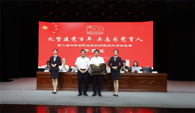 随后,陈垠亭为该校授“第二届河南省职业院校师德师风演讲竞赛协办单位”牌,院长梅乐堂代表学校接牌。