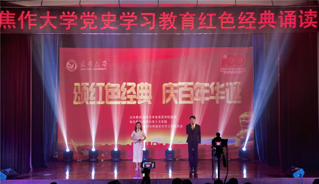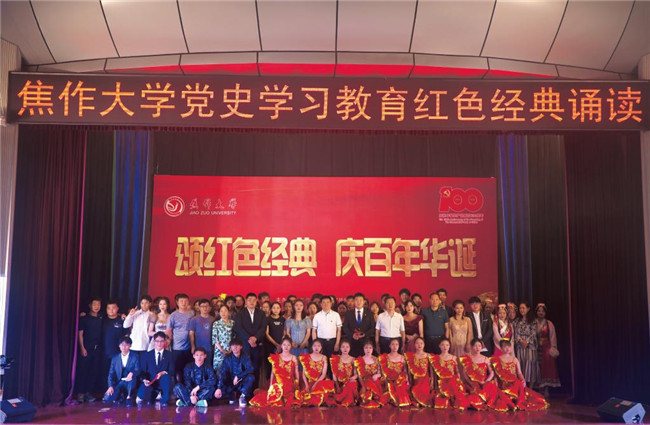 为深入开展党史学习教育,纪念中国共产党建党100周年,讴歌中国共产党百年来的伟大成就,贯彻落实党史学习教育动员大会上的重要讲话精神,全面落实校党委在党史学习教育活动中的工作部署,由焦作大学校党史学习教育领导小组主办,人文学院、校语言工作委员会承办的“党史学习教育红色经典诵读”活动于6月17日下午在该校南校区报告厅举行。校党委书记魏曰高、校党委委员、宣传统战部部长张继文、人文学院党总支书记李铁、总支副书记院长徐曼和全校师生代表一同观看了精彩的演出。