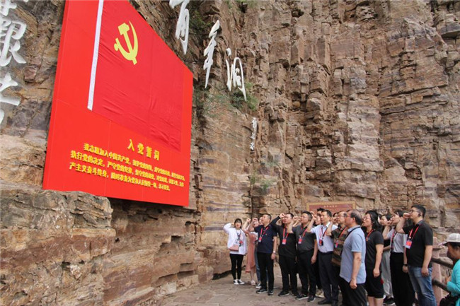 离开分水闸,大家怀着崇敬的心情,参观了红旗渠的咽喉工程——青年洞,行走在壁立千仞的太行山间,亲身体会当年林县人民把自己生命置之度外,在悬崖上荡秋千除险石的大无畏精神,亲身体会当年共产党员带领林县人修建红旗渠时昂扬的革命斗志和不畏艰难的革命精神。在青年洞前,全体党员面对党旗庄严宣誓,重温入党誓词,激励大家在工作中,不忘初心,牢记使命,不畏艰难,奋勇争先。