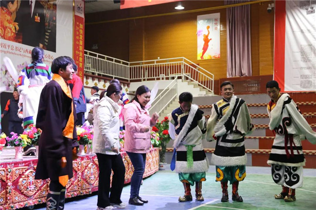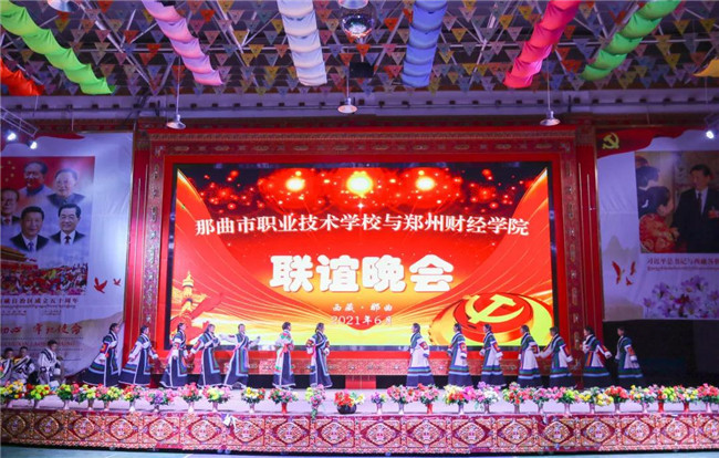 交流期间,那曲职校艺术团还准备了精彩的联谊晚会,艺术团师生载歌载舞,热情欢迎郑州财经学院援藏代表团。婉转悠扬的歌声,美轮美奂的舞蹈,尽展藏区同胞的热情和民族风情,为代表团成员留下深刻的印象。