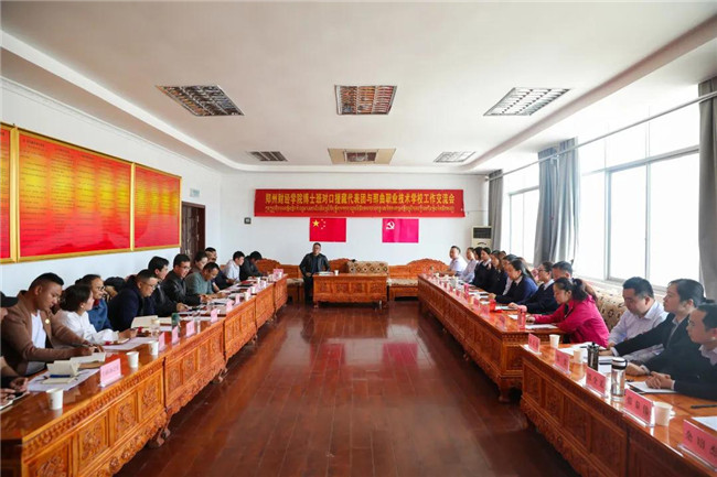 他简要介绍了那曲的地域概况,介绍了那曲职校发展历程、办学定位、机构设置、专业设置、师资队伍、人才培养模式、学校硬件设施等基本情况,介绍了学校借助援藏力量取得的发展,对郑州财经学院在人力、物力、财力等方面的援助表达诚挚谢意,阐述了学校未来发展规划与前景,期盼在双方合作努力下,共同推动藏区职业教育取得新发展。
