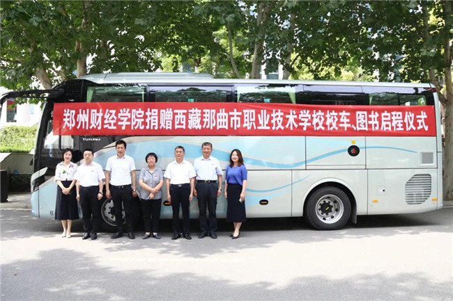 交流会后,双方在学校一号教学楼前举行了捐赠仪式。郑州财经学院向那曲职校捐赠客车一辆、图书一万册。双方交流期间,捐赠图书搭载捐赠客车,已在6月23日由专业人员驾驶从郑州财经学院出发,开往那曲。