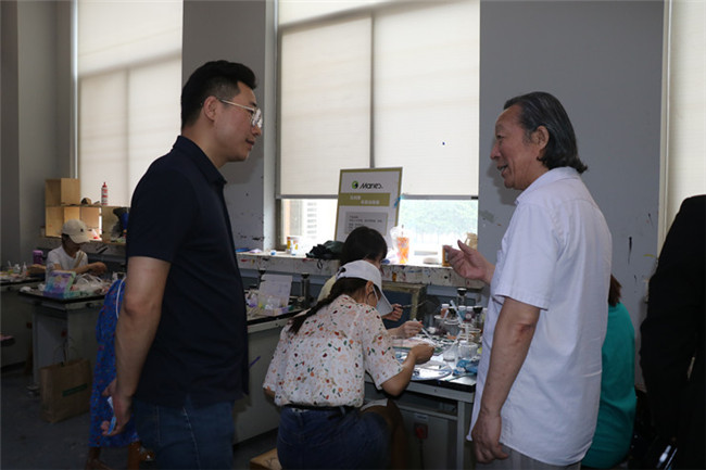 随后,企业来宾一行3人来到艺术大楼进行参观。艺术学院书记韦杨建、副院长赵维平带领企业来宾参观了艺术学院建党100周年的主题书画展、3D打印实验室以及木工坊实验室,期间大家围绕学生作品进行了专业交流。