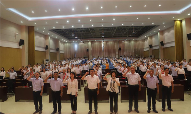 6月30日上午,黄河水利职业技术学院在大学生活动中心报告厅隆重举行庆祝中国共产党成立100周年暨“七一”表彰大会,校领导周保平、胡昊、杨士恒、焦爱萍、刘玉宾、菅浩然、刘守义、朱焕立出席大会,全体科级及以上干部代表、离退休党员代表、党外人士代表、教师代表、学生党员代表等300余人参加会议。大会由党委副书记、工会主席杨士恒主持。会议在全体党员高唱《国歌》中拉开序幕。