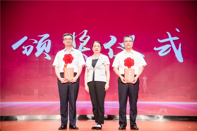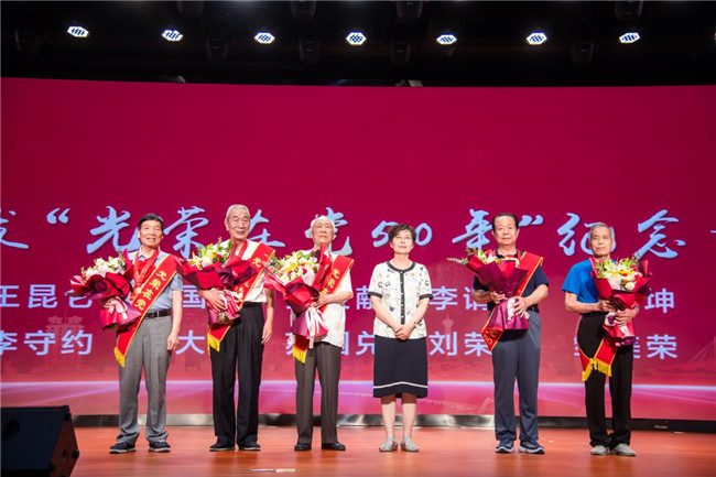 党委书记王霄鹂为“光荣在党50年”老党员代表颁发纪念章