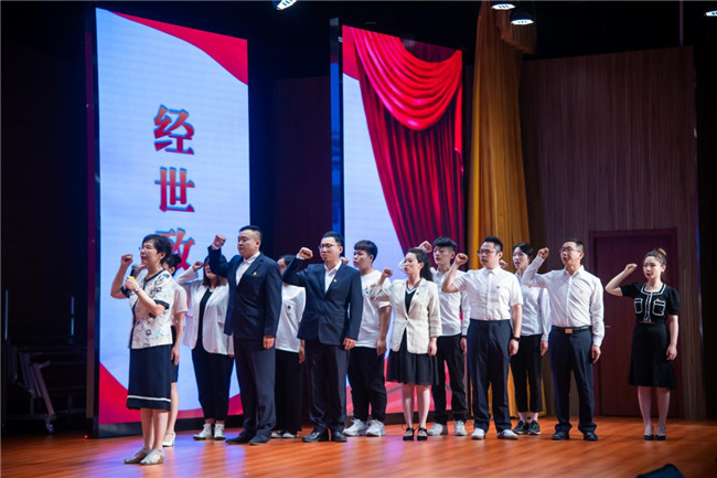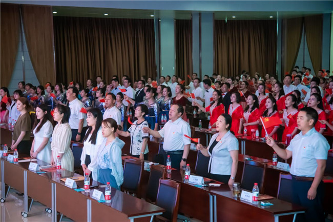 党委书记王霄鹂带领新党员进行入党宣誓、全体党员重温誓词。全体党员举起右拳,面向鲜红的党旗,庄严宣誓,铿锵有力的宣誓声响彻整个会场。