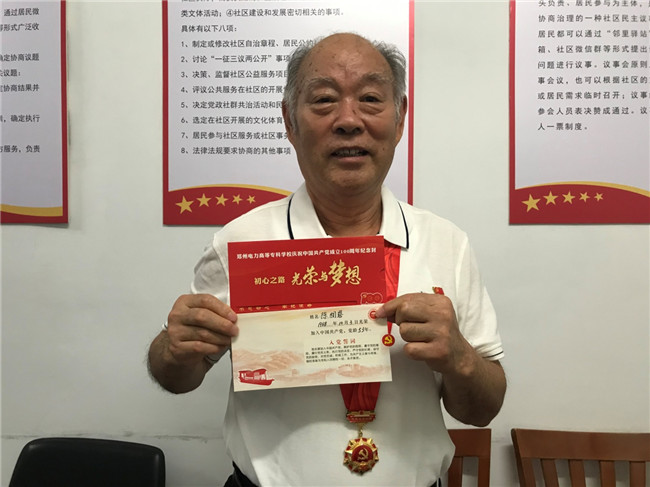 学校离退休党员、“光荣在党50年”纪念章获得者陈相恩老师打开党员纪念封,将内页徐徐拉出,伴随着红船从诞生地划到100年,脑海里不断涌现着中国共产党百年风华的壮阔征程,在内页上工工整整的写上了自己的名字和党龄,每一笔都书写着自己作为一名共产党员的初心使命,每一划都镌刻着在党十五年的光荣与梦想……