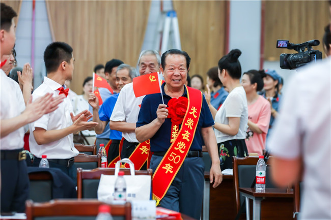 伴着《红旗颂》的乐曲,“光荣在党50年”的老党员代表胸戴红花、身披绶带,精神抖擞地走入会场。这时,全场响起雷鸣般的掌声,全体教职工列队欢迎,表达对老党员们的崇敬之意。
