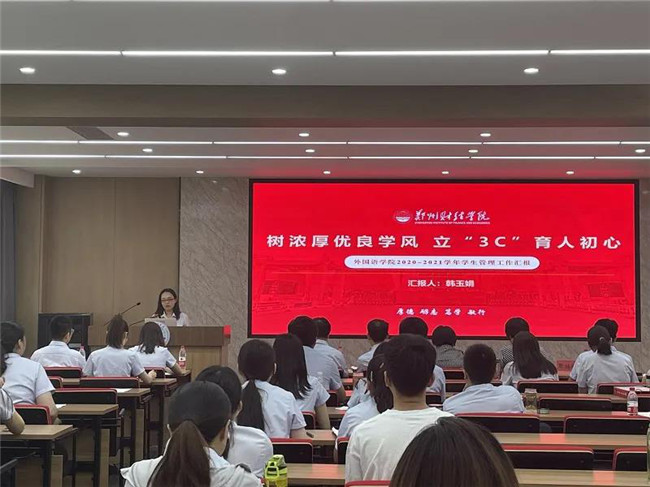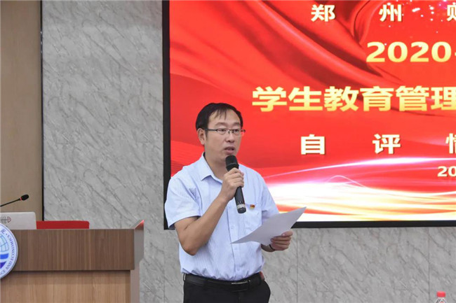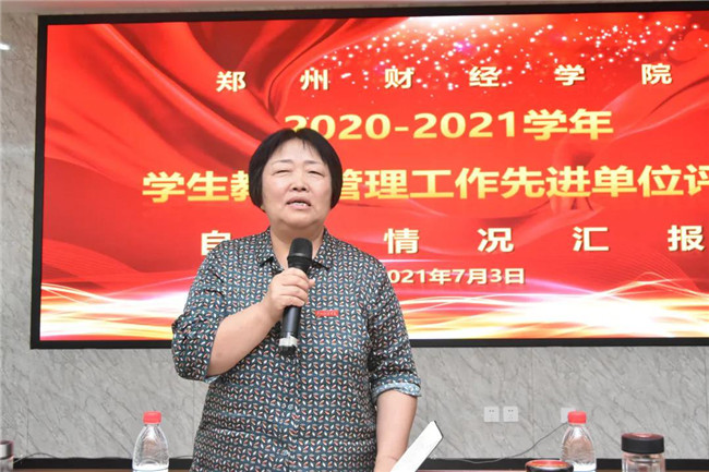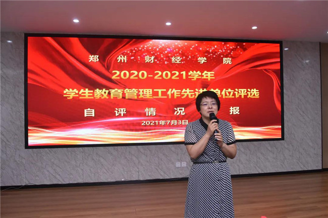7月3日,郑州财经学院2020-2021学年学生教育管理工作先进单位评选自评情况汇报会在A楼第一学术报告厅召开。校长于向英、副校长陈静出席汇报会。学生处处长陈志强、校团委书记周二涛、宿管中心处长张继栋、学工部副部长吕洛乐、学生处副处长李坤,各二级学院党总支书记、副书记及辅导员代表参加汇报会。汇报会由陈志强主持。