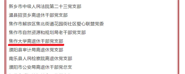 为大力选树先进典型,激励各级离退休干部党组织、广大离退休干部党员更好地奋斗新时代、奋进新征程,省委老干部局在全省开展离退休示范党支部创建工作,焦作大学离退休党支部狠抓基层、大抓基础、努力奋进、力创特色,为创建示范支部不断努力。日前,省委老干部局印发通知,公布第二批省级示范离退休干部党支部名单,焦作大学离退休党支部榜上有名。