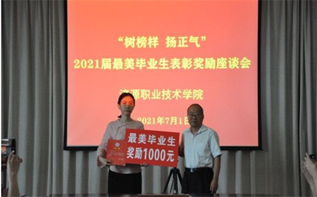 2021年7月1日,济源职业技术学院召开“树榜样,扬正气”2021届最美毕业生表彰奖励座谈会。院长李国锋向2021届最美毕业生获得者赵瑷一、范懿、赵志鹏、徐嵩泊、宋卓颁发了证书,5名最美毕业生获得者的辅导员代为领奖。