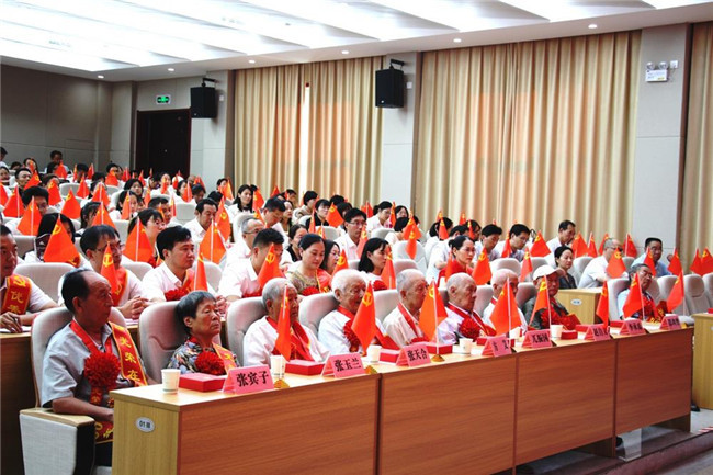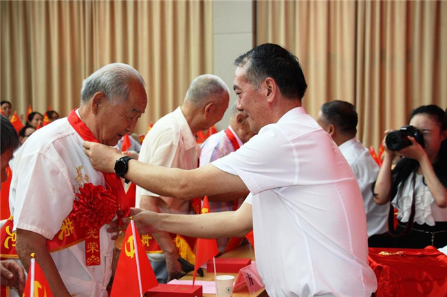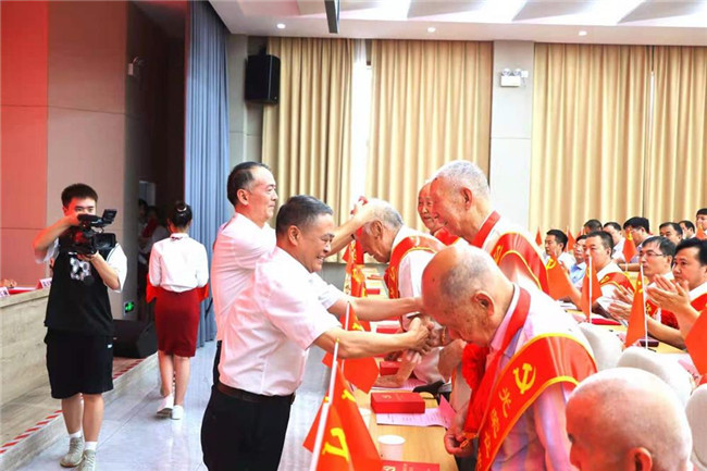 冯慰冬和宋宏伟一起走到台下为“光荣在党50年”老党员代表逐一佩戴纪念章,并向老同志们表示诚挚的敬意。