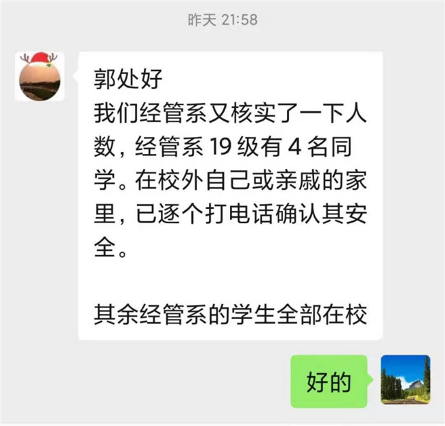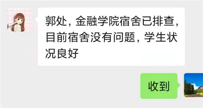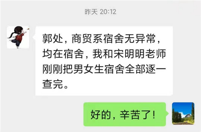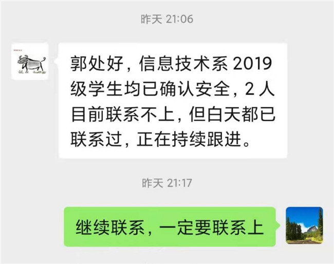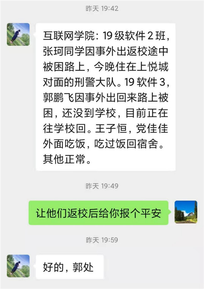 截止21时许,所有在校生已经清点完毕,除8名学生外出办事不能及时返回,其余学生全部在寝室且情绪稳定。校外8名学生,经辅导员积极协调、沟通,已到亲戚家或就近派出所等地休息过夜。在学生无法进出的情况下,学生处还积极配合、协调教务处、后勤处,保障学生的学习、用餐等事宜,尽力推动学生在此期间的正常学习生活。