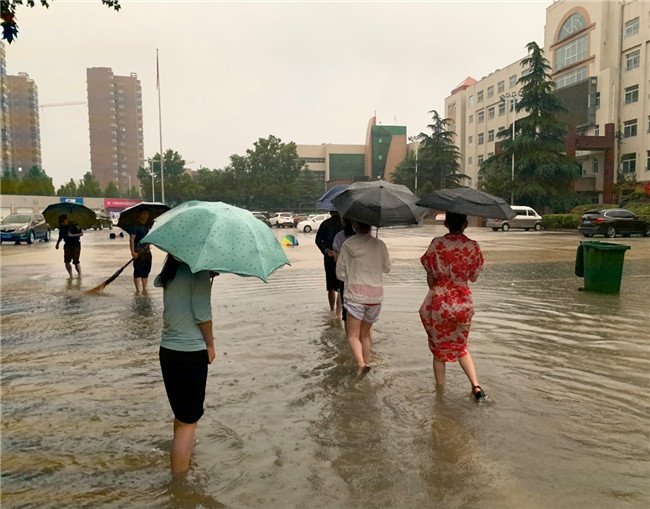 7月20日,一场暴雨突袭了中原大地,郑州多地被淹,郑州财税金融职业学院平日安静的校园一时间被大雨淹没。前广场、宿舍楼、教学楼门前出现严重积水,同时学校出现了部分教学楼、宿舍楼停水停电现象,学院党委紧急部署校园防洪安全事宜,疏散正在教学楼上课的教师、学生。