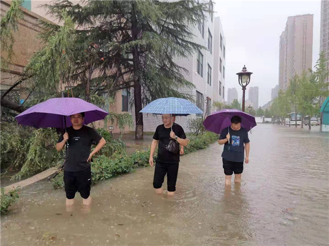 为了保障暴雨中学生的生命安全,郑财院学工人犹如钢铁战士一般,冲在了前线,紧急开展了学生安全排查工作。施长春副院长带领一行人冒雨在校园中每个角落逐一排查安全隐患,督促学生不要逗留,快速回寝。