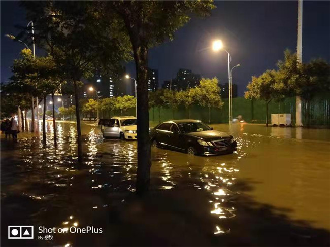 7月21号晚,会计2001班岳汉在濮阳市华龙区苏北路中段,将两位被困人员和车辆转移至安全区域。(魏豪)