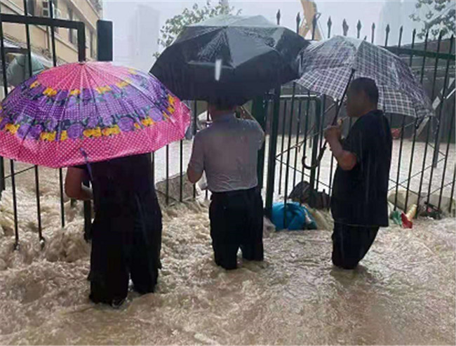 战斗惊心动魄。20日下午14时30分,由于雨势迅猛,东明路校区排水能力有限,校区积水明显增加,最深处约50cm。部门负责人王浩然、张莹两位同志冒雨对校区内的主要交通道路、学生宿舍、餐厅、超市、青年公寓楼,家属院等区域进行防涝防汛排查,经分析研判,认为是由于进修楼通道路面排水受阻导致。为保证校区排水通畅,他们立即组织保卫处人员利用木棒,梯子等工具对疫情防控时封闭的校区北门进行破拆,并安排专人密切监视水位变化情况。在大家的共同努力下,校区积水奔涌而出,水位明显下降。下午16时,由于降雨持续,校区南侧金水河漫堤,校园积水迅速增加!困难面前,两位同志立即进行了工作分工,王浩然趟着齐腰深的积水,负责查看主要排水口情况,张莹同志负责查看学生宿舍楼情况。此时家属院15、16号楼地下室已没入水中,东南处积水已达到肩膀处,约150cm,学生餐厅一楼水深至腰部,2号学生宿舍楼一层宿舍则全部进水,积水深至床板。17时左右,金水河水在冲毁河道管理处房屋后倒灌入校园内,校区积水迅速上升,最深处达160cm。大量河水倒灌造成东明校区两栋宿舍楼、学生餐厅、配电房、洗浴中心均有不同程度进水,平均水深40cm。其中2号学生宿舍楼距离金水河溃口仅有4米,一楼宿舍全部被淹,水深70cm,物料漂浮,满目狼藉,情况万分危急,形势异常严峻!按照校党委书记别荣海、校长许二平等校领导的要求,学校东明办、保卫处、后勤服务中心等部门的同志统筹安排、通力协作,克服重重困难,迅速对学生进行了转移安置,全力确保师生安全;同时,派专人严密监视金水河溃口情况,想尽一切办法防止水位继续上升,造成更加严重的后果。晚上19时许,400余名学生全部转移安置完毕,同时切断了校区电源,对学校超市、洗浴中心,餐厅等场所的职工进行了安全疏散。20日夜间,在防汛设备、人员物资缺乏,无法联系公安消防等外部救援力量的危急情况下,王浩然、张莹、杨结实等带领保卫处等部门的同志,利用床板等现有工具多次尝试围堵金水河溃口,但由于溃口较大,水流湍急,一直未能成功。为防止校区积水情况进一步恶化,他们彻夜坚守岗位,严密监视溃口及校园各处情况,保证在汛情发展后能够第一时间进行处置。